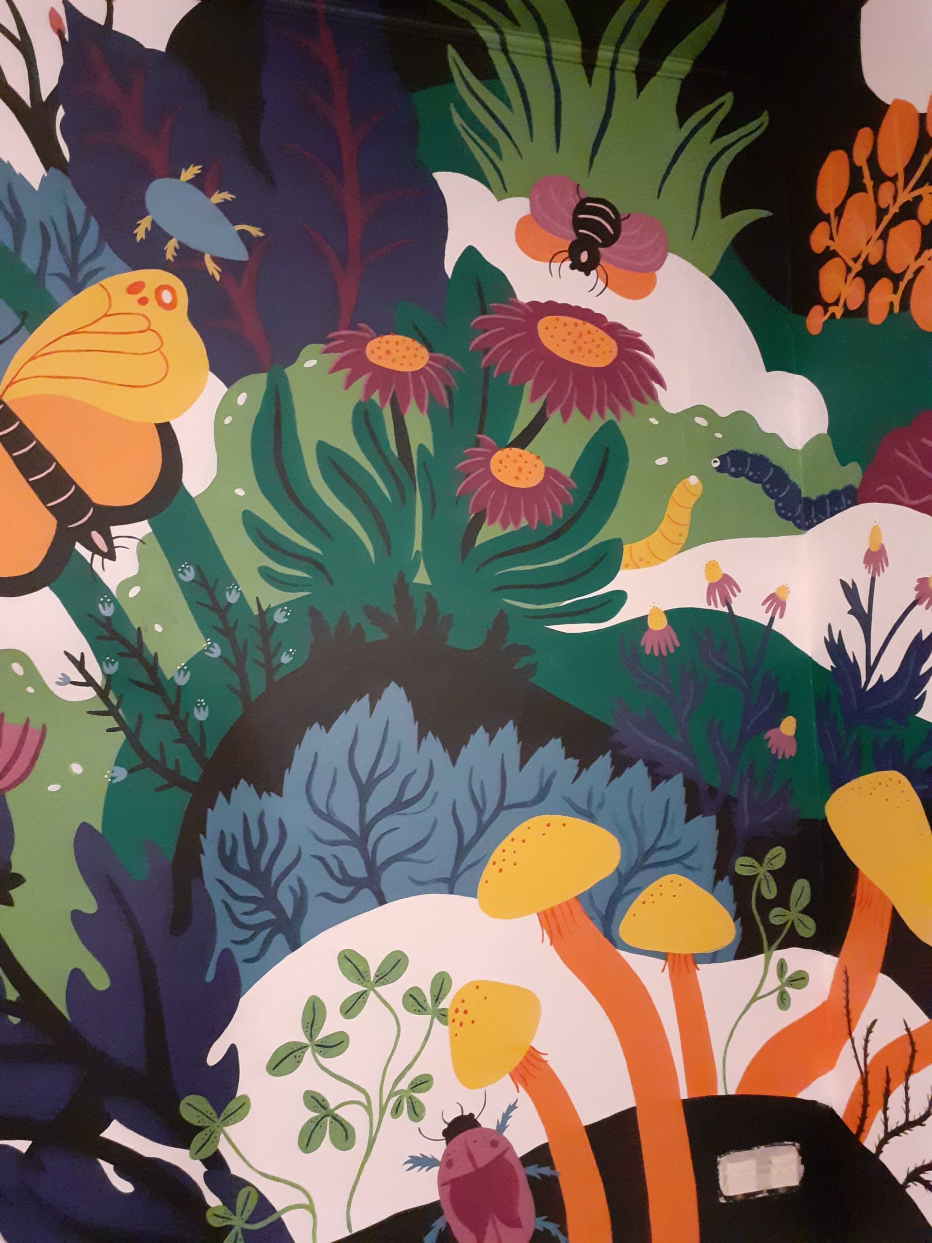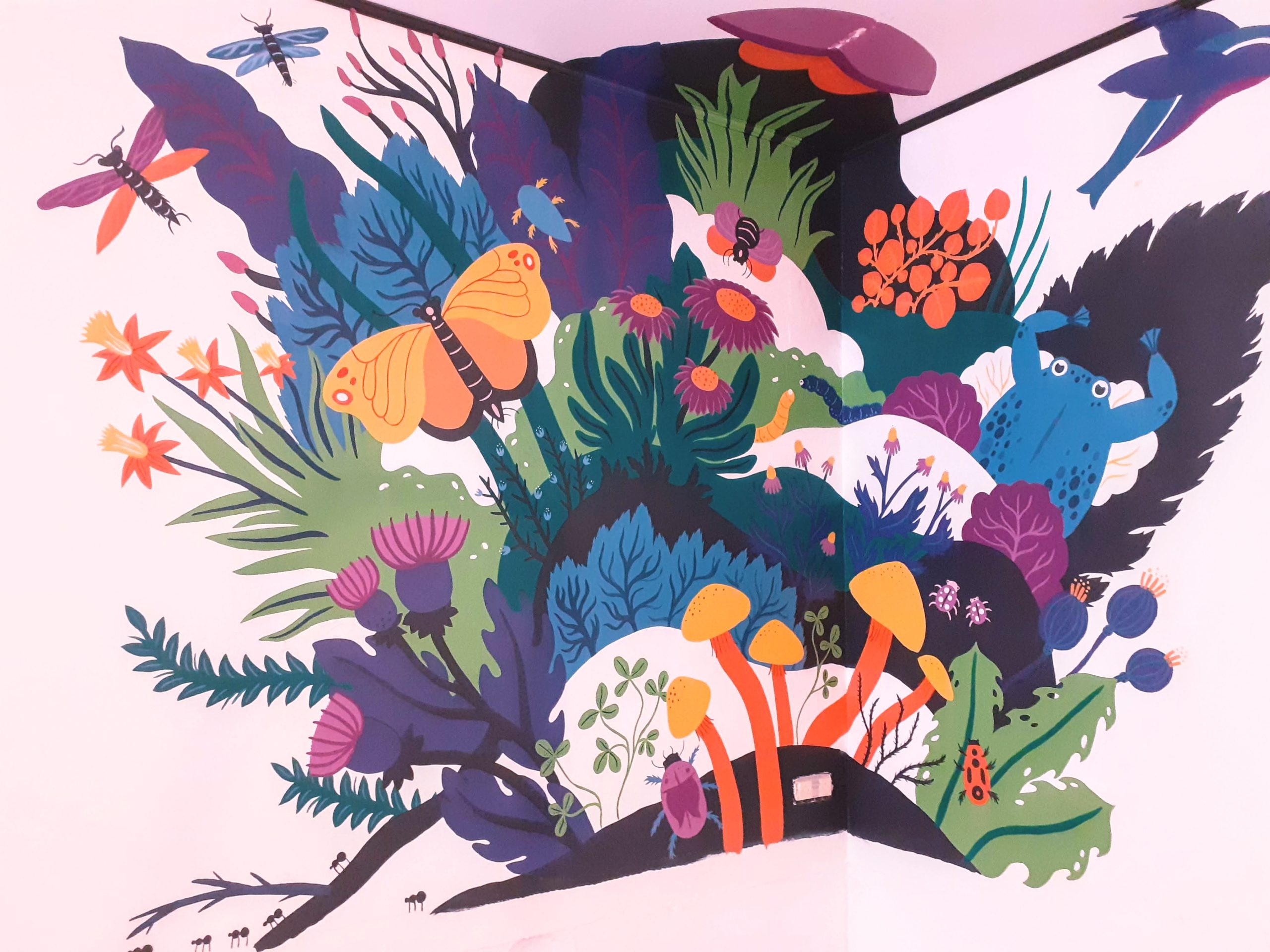 Fresque murale réalisée à la peinture directement sur le mur. Elle orne le magnifique café tier-lieu "Chez Bibi" situé dans un petit village près de Namur.