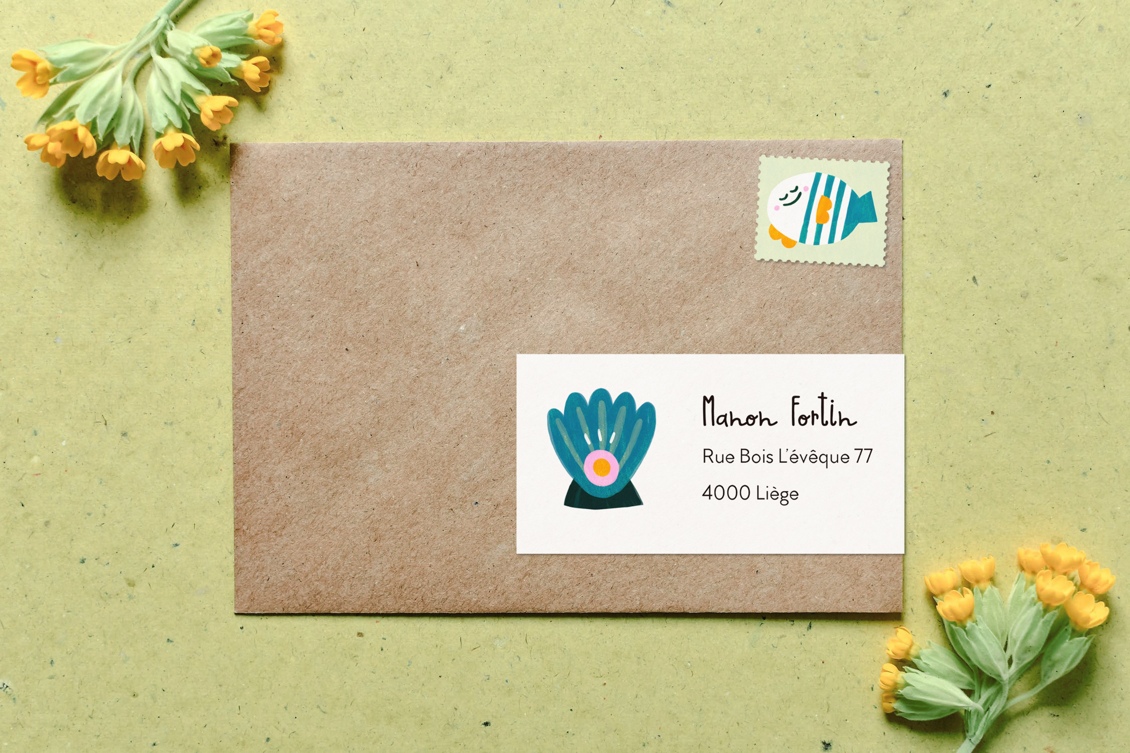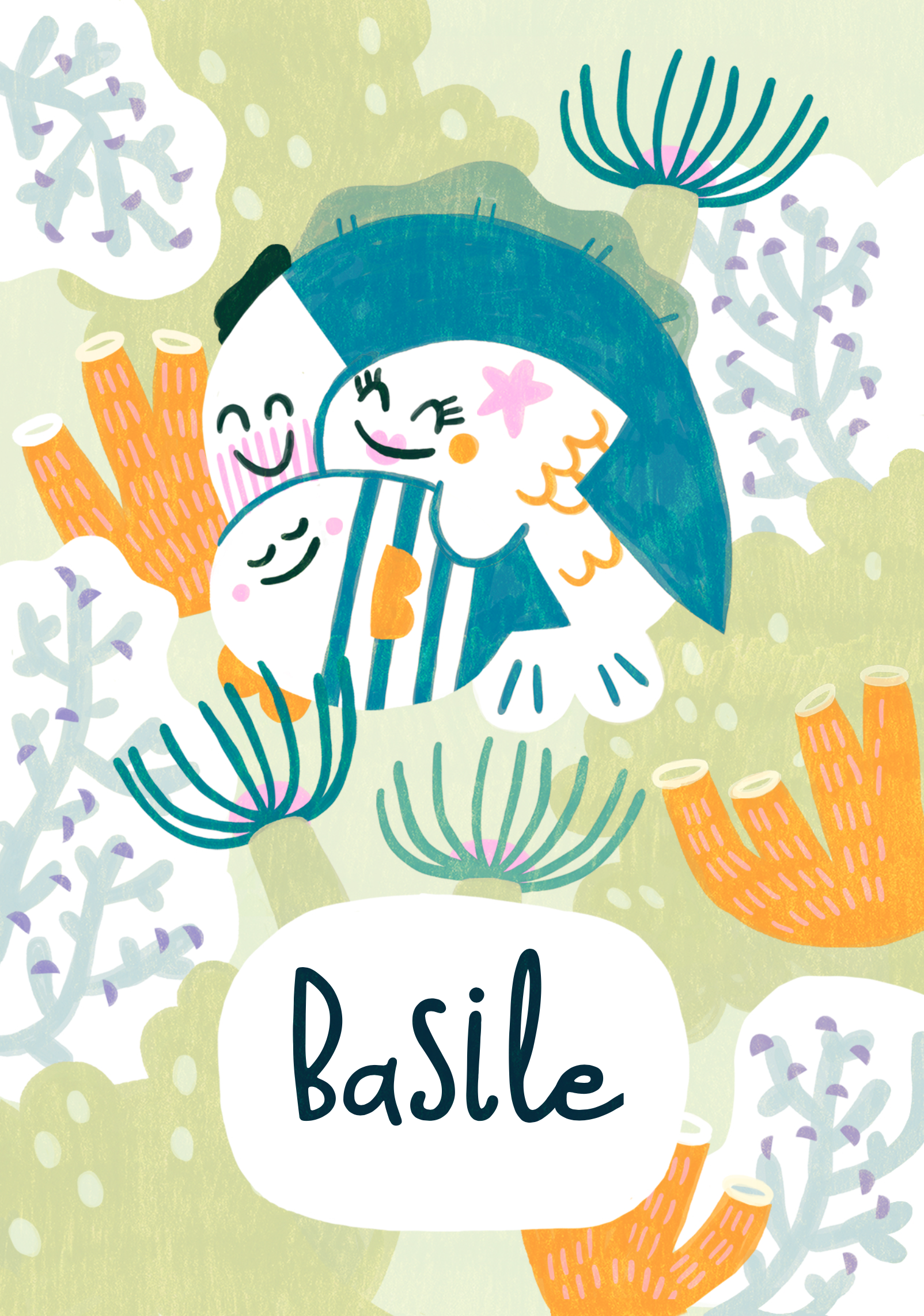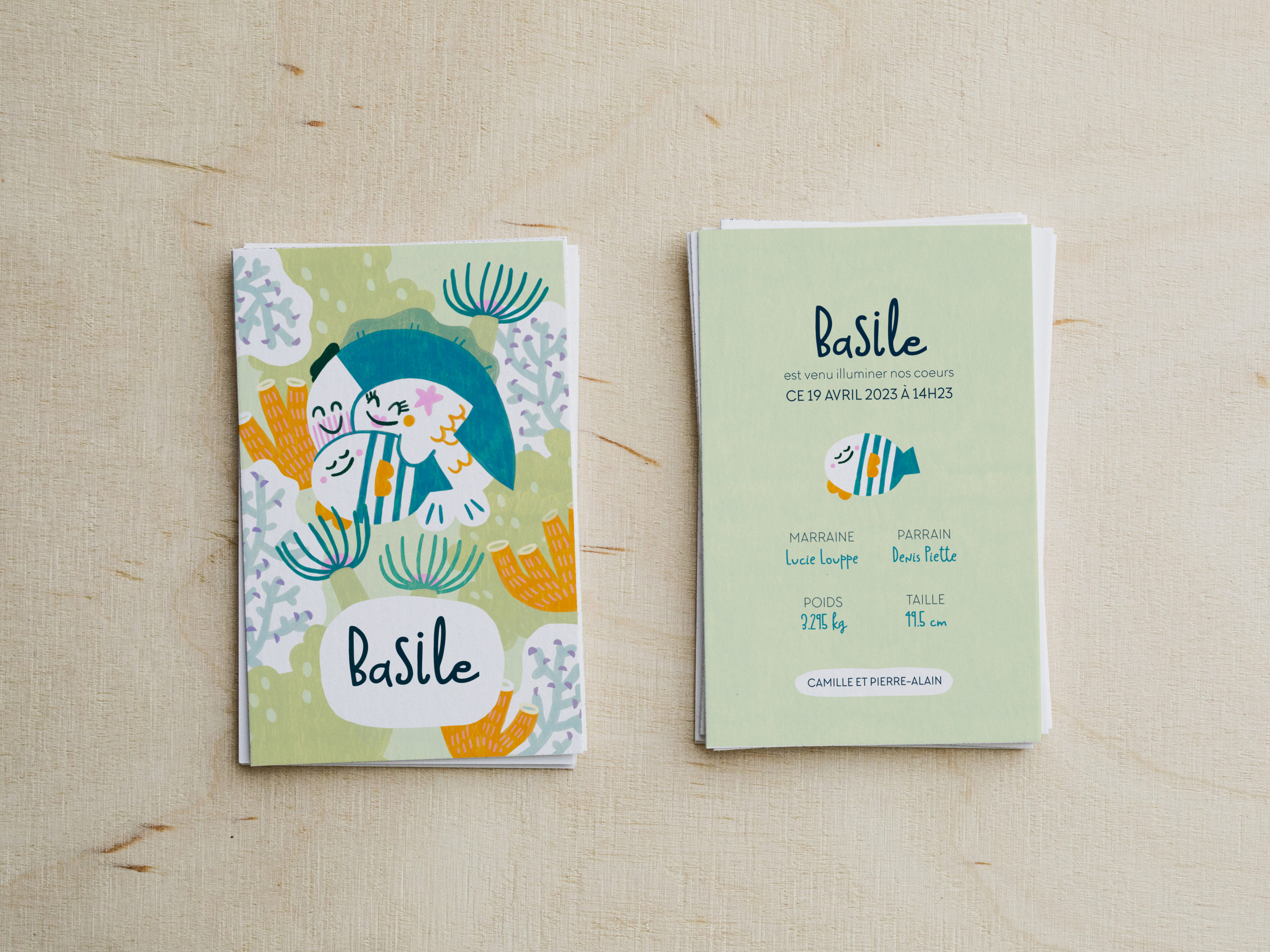 mockup du faire part de basile avec des poissons qui s'enlassent et des corails